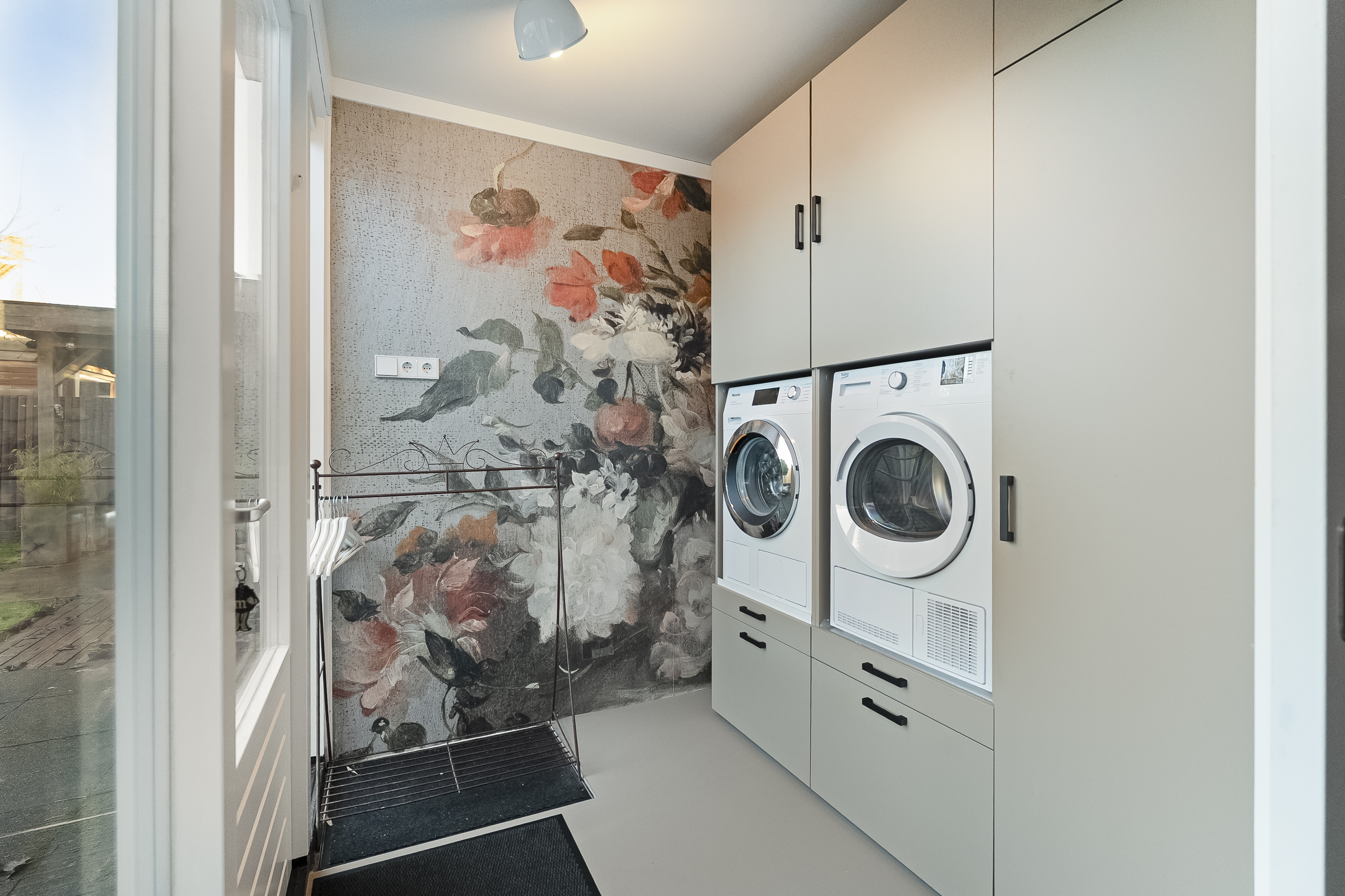 Via de royale oprijlaan en de charmante voortuin bereik je de entree van deze warme en uitnodigende woning. In de hal vind je een luxe toilet en toegang tot de riante woonkamer, waar de vloerverwarming en het zachte daglicht meteen voor een huiselijk gevoel zorgen. De woonkamer vloeit harmonieus over in de uitgebouwde woonkeuken, het hart van het huis. Hier kook je met liefde, omringd door hoogwaardige inbouwapparatuur zoals een elektrische kookplaat, afzuiginstallatie, combimagnetron, vaatwasser, koelkast/vriezer, warmwaterkraan en een wijnklimaatkast. De openslaande tuindeuren en twee Velux-lichtkoepels laten zon en lucht rijkelijk binnenstromen. Aansluitend ligt de praktische bijkeuken met aansluitingen voor wasmachine en droger.